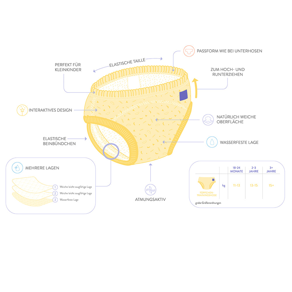 Durch eine versteckte, saugstarke Lage aus Frottee mit PUL werden kleine Pannen während des Töpfchentrainings zuverlässig aufgefangen. Nach einem Pipi muss die Trainingsunterhose jedoch gewechselt werden, denn sie hat nur eine begrenzte Saugfähigkeit und ersetzt keine Windel.