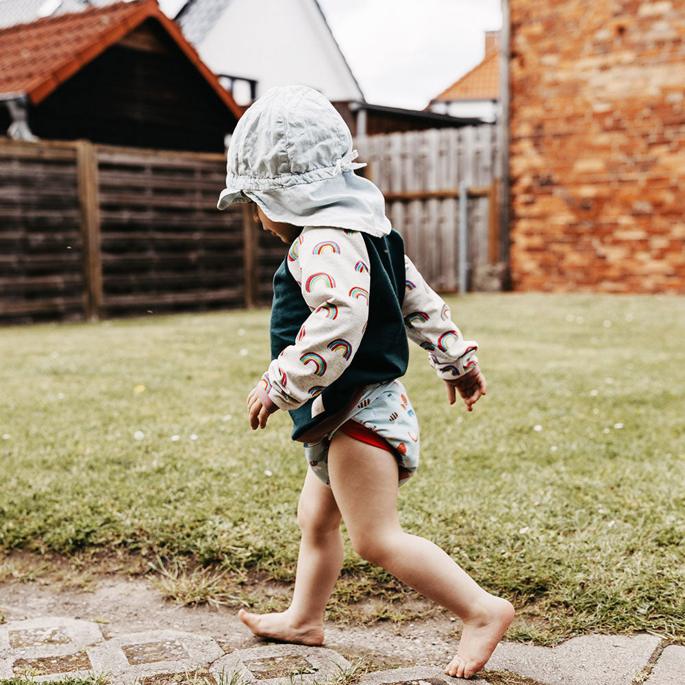 Die Überhose besteht aus feinem Bio-Baumwoll-Jersey. Diese Material ist wunderbar dünn, anschmiegsam und passt sich jeder Bewegung Ihres Babys an. Ein breites, elastisches Jersey-Bündchen sorgt zusätzlich für noch mehr Komfort und bietet eine tolle Passform.
