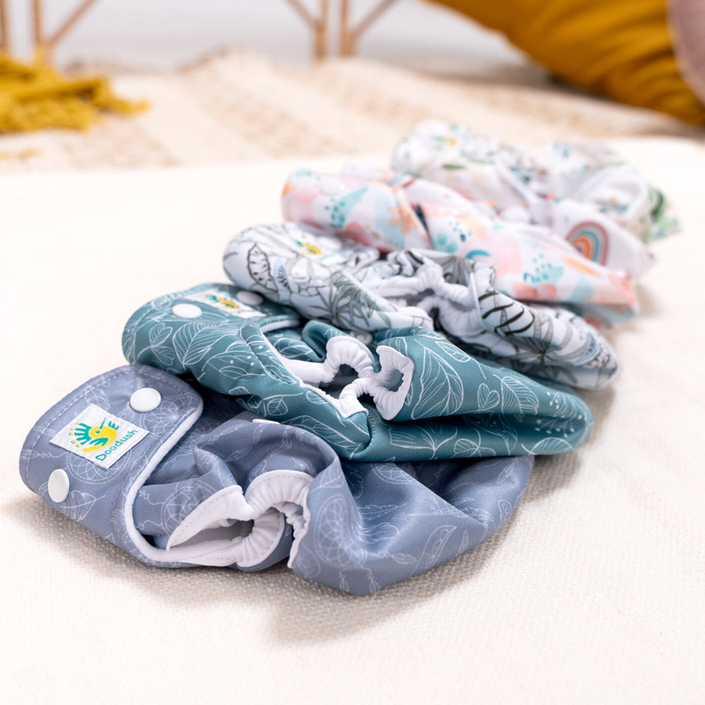 Pflege und Waschen: Die Doodush Überhose ist super schnell getrocknet und nach wenigen Minuten am Wäscheständer schon wieder einsatzbereit. Oft kann die Überhose auch direkt wiederverwendet werden, wenn die Saugeinlagen alles aufgefangen haben. Waschbar bei 60 °C, auf der Leine trocknen. Vor dem ersten Tragen bitte die Überhosen einmal auf 60 °C mit Stoffwindelwaschmittel vorwaschen. Schmutzige Überhosen und Einlagen bis zur Wäsche bitte kühl und trocken lagern - nicht einweichen.