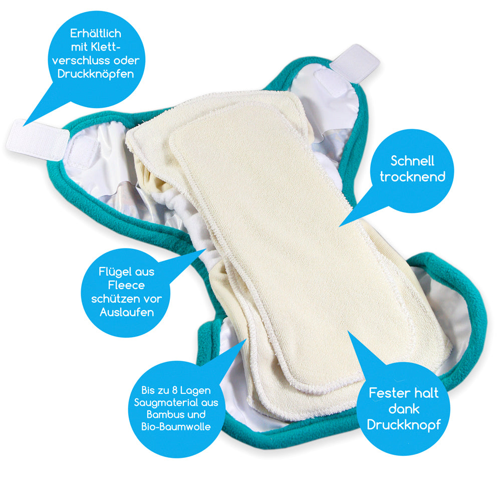 • Doppellagiger PUL für verbesserten Auslaufschutz