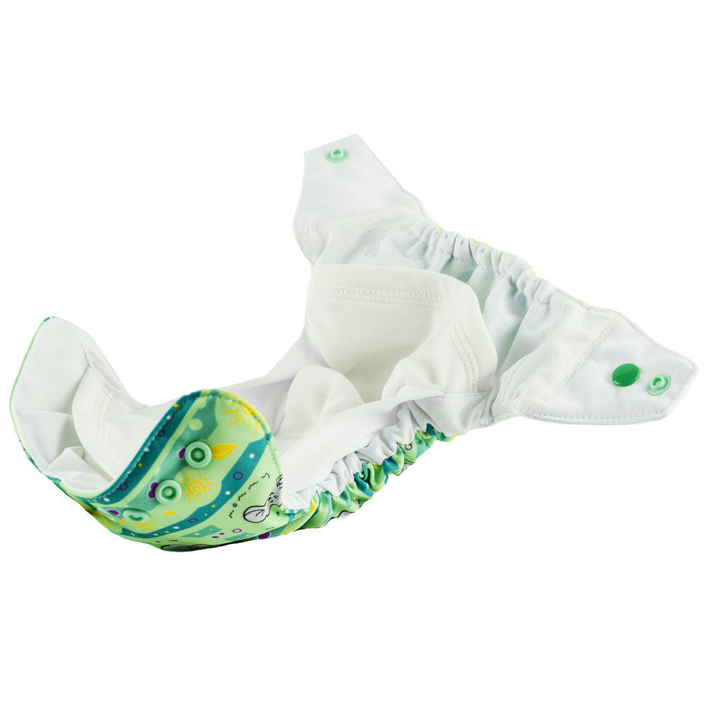 Die fest vernähte Zusatzeinlage kann doppelt gefaltet werden, sodass die meiste Saugfähigkeit dort konzentriert ist, wo das Baby sie braucht - für Jungs vorne und für Mädchen mittig. Beim Waschen und Trocknen klappt der Saugkern aus, dadurch trocknet die Windel schneller.