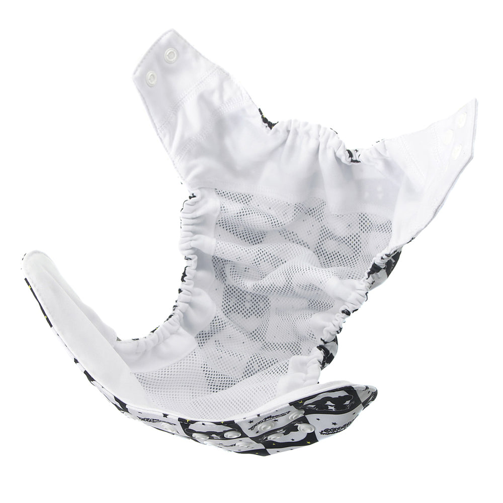 Die Mommy Mouse Überhose mit Prefold-Lasche ist ein Allroundtalent - erhältlich in drei Größen: Newborn, One Size und XL. Sie passt für verschiedene Stoffwindel-Lösungen, z.B. Prefolds und (Wegwerf-) Einlagen. Spezielle Laschen im Innern der Überhose sorgen dafür, dass die Einlage nicht verrutscht. Die Prefold-Lasche ist PUL-beschichtet, so wird keine Feuchtigkeit nach außen gezogen. Dennoch ist die Überhose auch breit genug geschnitten, um komfortabel über Nachtwindeln (Höschenwindeln) zu passen.