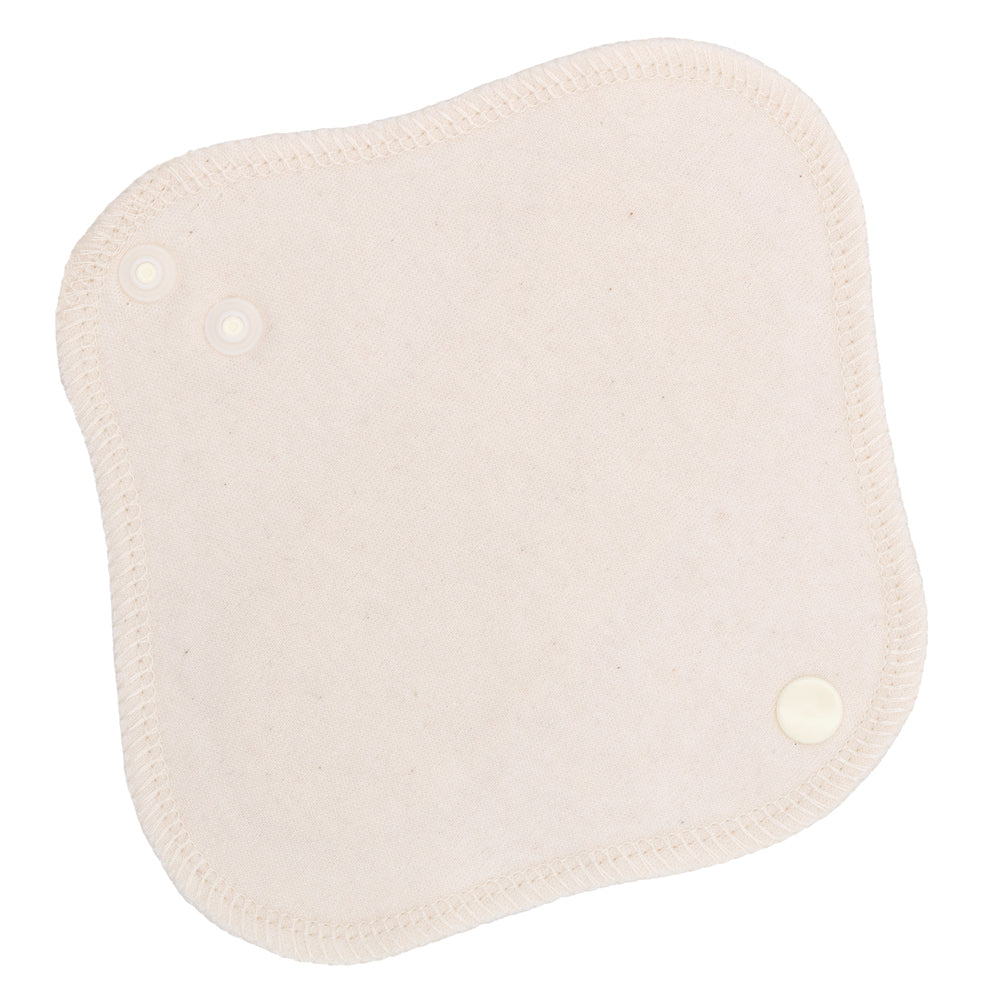 Legen Sie die Binde mit der weichen Seite nach oben in den Slip ein. Die Seitenflügel der Einlage werden um den Slip gelegt und mit einem Druckknopf geschlossen. Die Flügel sollten sich dabei im vorderen Bereich des Slips befinden. Maijat Stoffbinden bieten eine zweifache Weiteneinstellung, für eine optimale Größenanpassung.