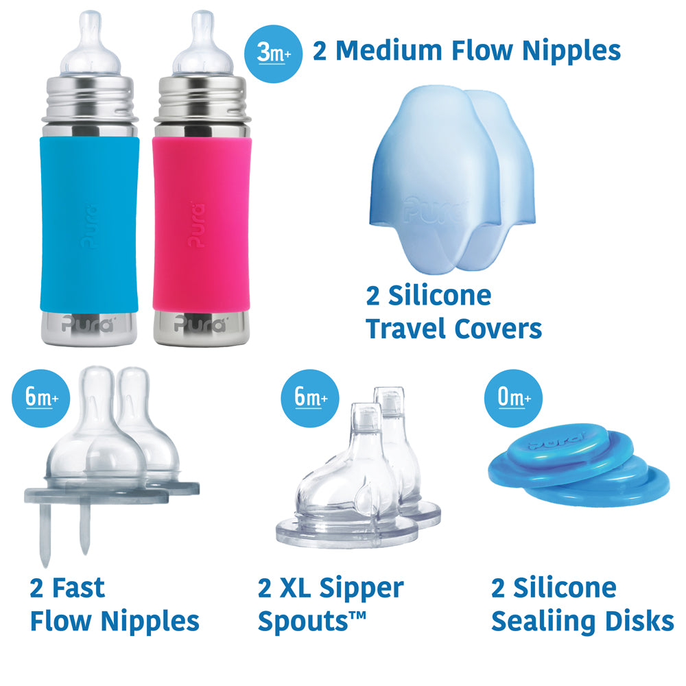 Pura Kiki Trinkflasche - Geschenkset - 2x 325ml Flaschen (inkl. 5x Zubehör)