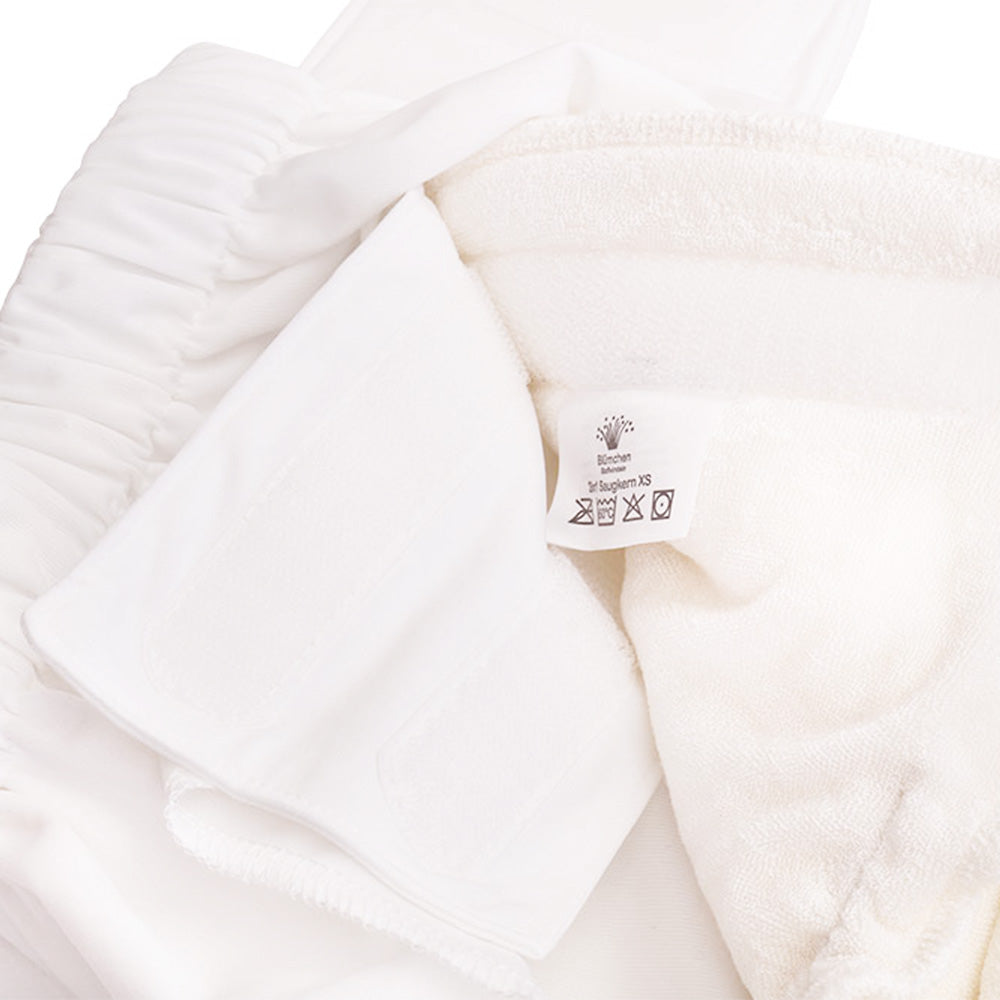 Die Stoffwindeln haben einen weichen, breiten Klettverschluss, der zur optimalen Größenanpassung auch überlappend geschlossen werden kann. Die weiche, atmungsaktive Außenhülle beugt einem Wärmestau vor und lässt die Haut atmen.