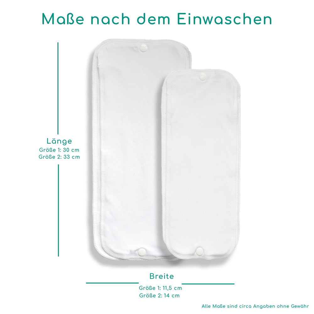 Bitte beachten: die Saugeinlagen erscheinen zunächst zu groß, sie schrumpfen während der ersten Wäschen auf die passende Größe ein. Die Einlagen in Größe 1 passen in Thirsties Überhosen Gr. 1 und Blueberry Capri Newborn. Die Saugeinlagen in Größe 2 sind passend für Thirsties Überhosen Größe 2 und Blueberry Capri OneSize oder Pocketwindeln.
