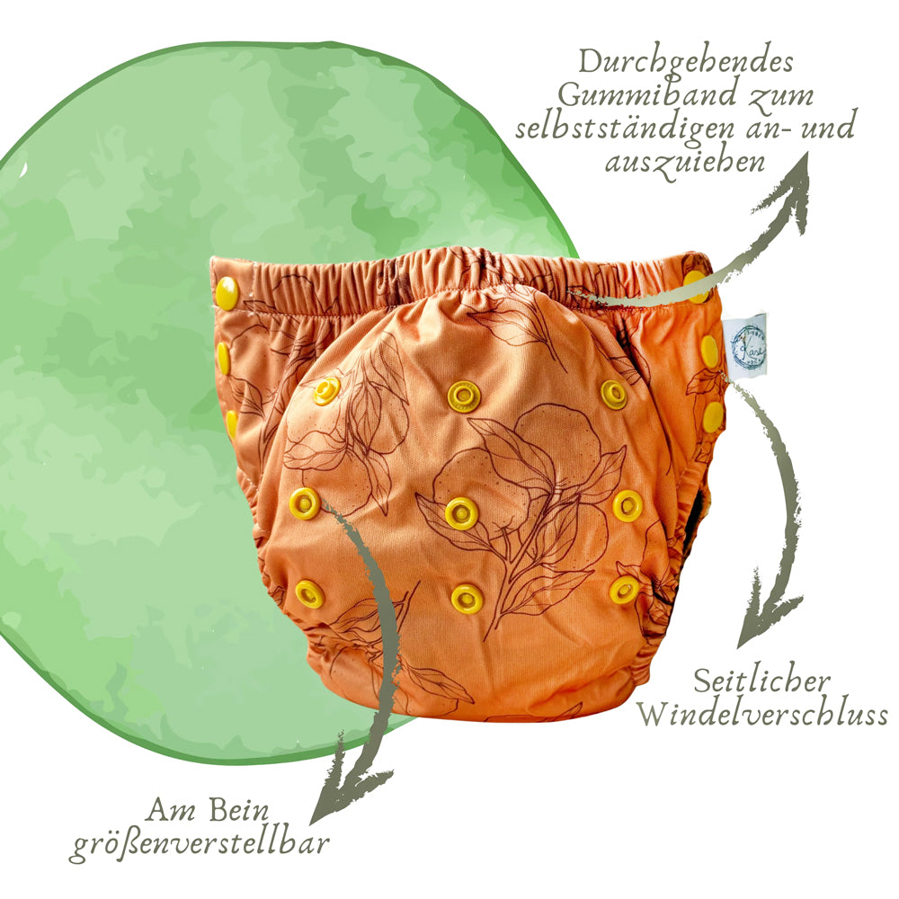 Die siebenKÄSEhoch Trainer fördern außerdem die Selbstständigkeit im Prozess des Trockenwerdens deines Kindes. Durch den rundum laufenden Gummizug am Bauch kann der Trainer ganz einfach selbstständig von deinem Kind an- und ausgezogen werden.