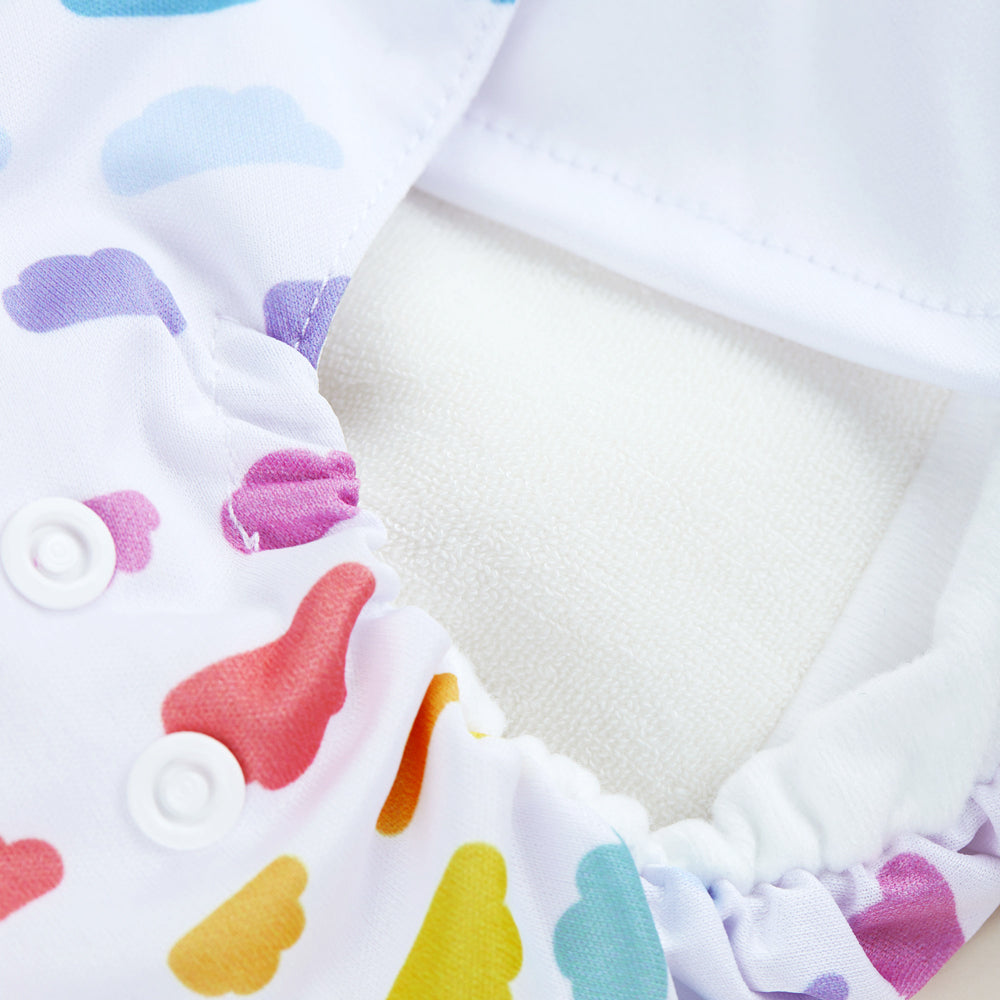 Ein wasserdichter Umschlag am Bauchabschluss bildet einen Auslaufstopp für den vorderen Nässebereich, dies ist besonders bei Jungen entscheidend. Der Klettverschluss und die Druckknöpfe sind vollständig mit wasserdichtem PUL-Stoff unterlegt, sodass keine Feuchtigkeit durch die Nähte des Klettverschlusses oder die Druckknöpfe ziehen kann.