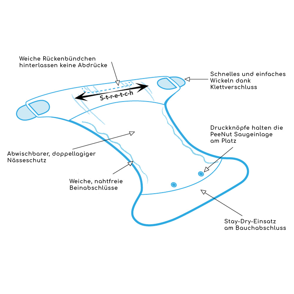 Bei der Entwicklung der PeeNut V2 wurde besonders auf die Auslaufsicherheit Wert gelegt. Die Überhose ist innen komplett mit einer zusätzlichen PUL-Schicht versehen. Dieser zweilagige PUL bietet vollflächigen Schutz vor Durchnässen der Überhose über den Klettverschluss und den Pul-Stoff. Durch die innenliegenden Beinbündchen kann keine Nässe mehr nach außen ziehen. Bei der PeeNut V2 wurde innen auf Laschen verzichtet, sodass sich die Überhose nach dem Windelwechsel leichter innen abwischen lässt, so ist sie meist sofort wieder einsetzbar.