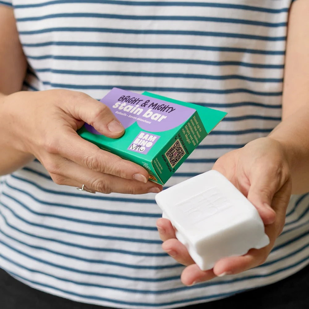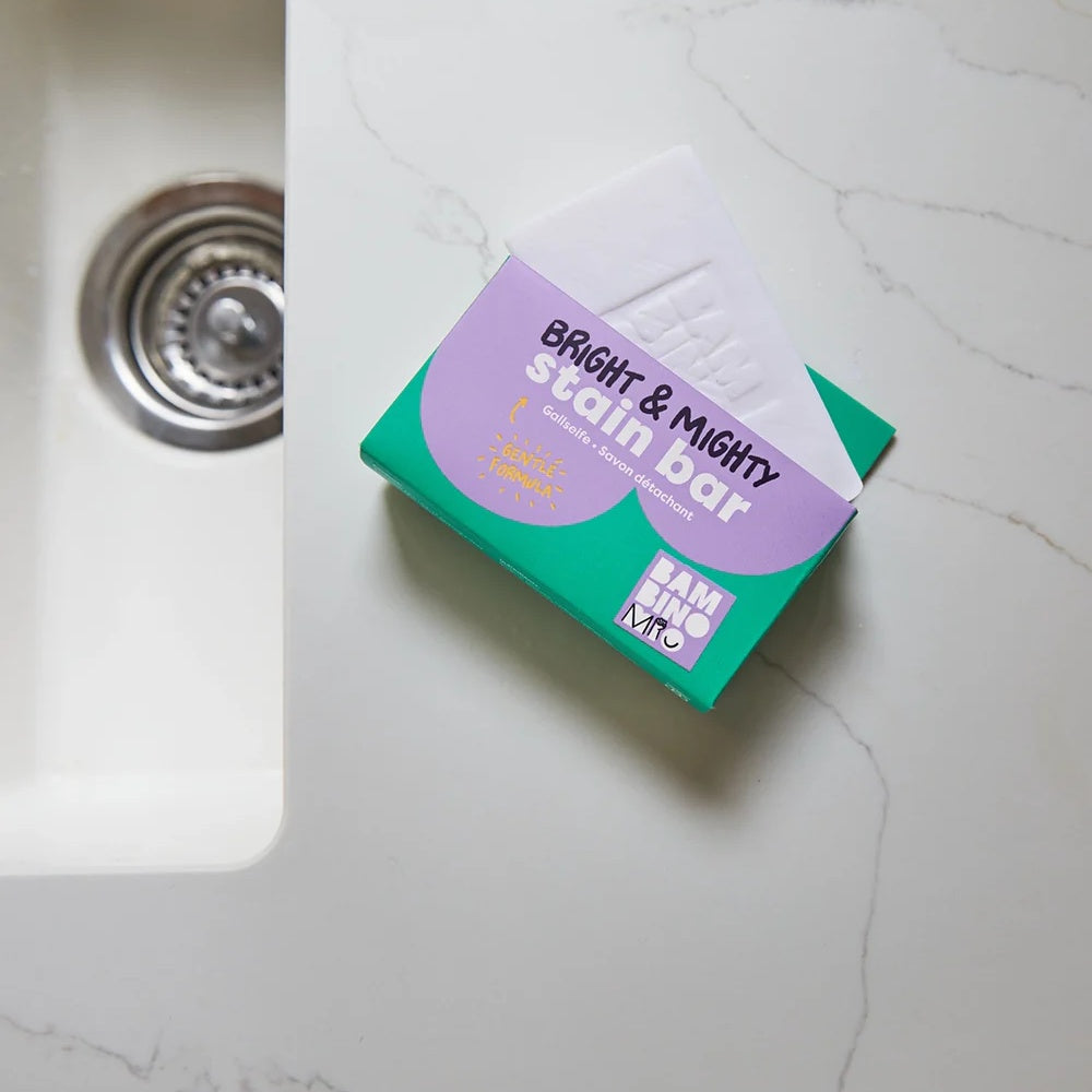 Die Bright & Mighty Fleckenseife von Bambino Mio (auch als Stain Bar bekannt) ist dein kompakter Helfer bei hartnäckigen Flecken. Ob Babynahrung, Gras oder andere Alltagsspuren – diese Seife wirkt schnell und zuverlässig, bevor sich Schmutz festsetzen kann.