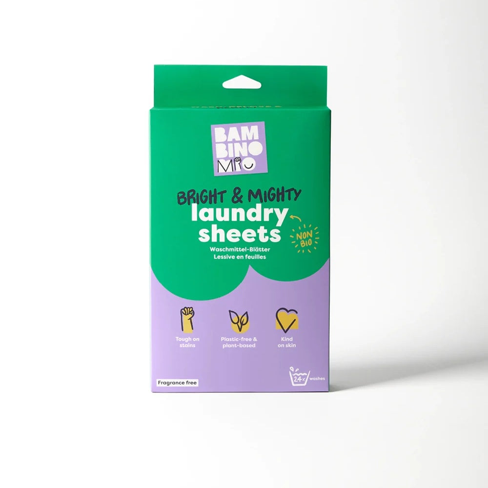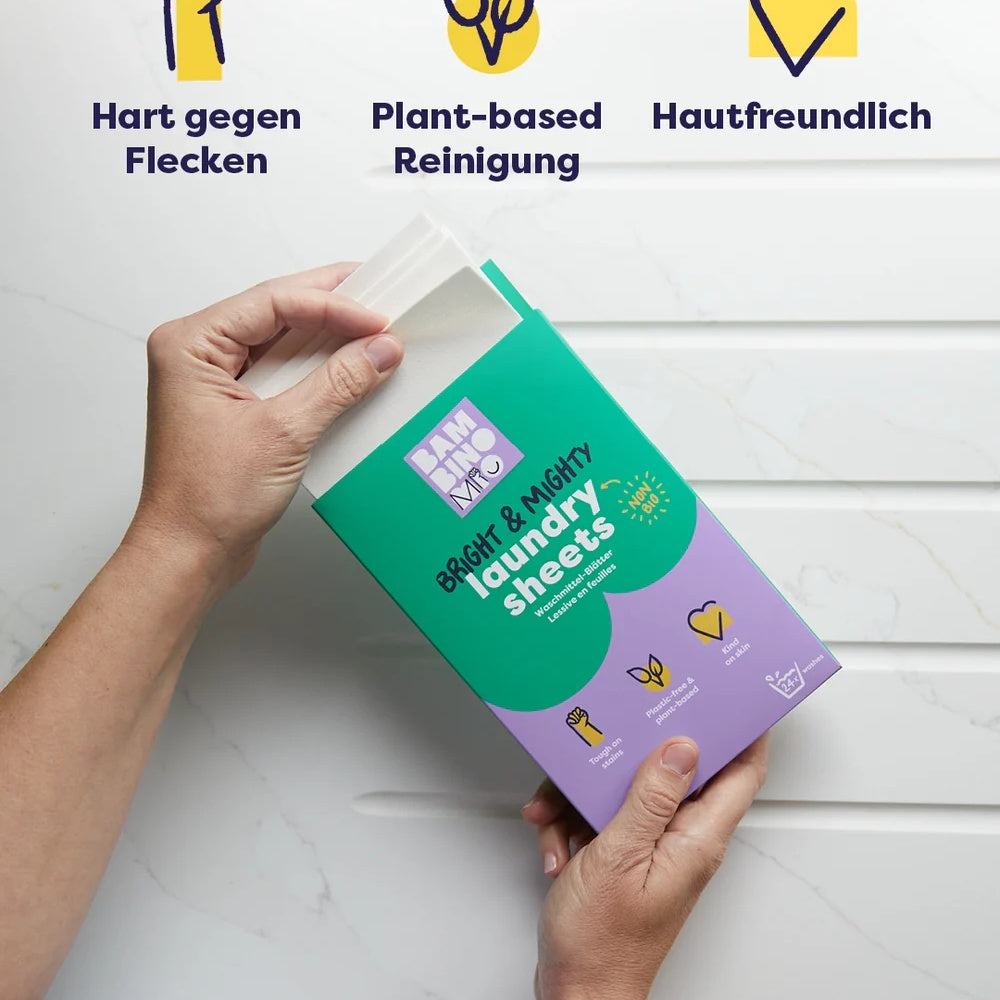 Die Bright & Mighty Waschblätter von Bambino Mio vereinen die Kraft eines hochwertigen Waschmittels mit einer cleveren, platzsparenden Form – ganz ohne Flüssigkeit, Pulver oder Dosierkapseln.