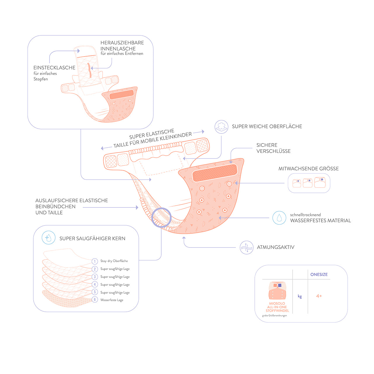 Diese All-In-One-Windel lässt sich ebenso einfach nutzen wie eine Einwegwindel! Die One Size Windel wächst von der Geburt bis zum Töpfchentraining mit deinem Kind mit. Dies spart wertvolle Ressourcen und schont deinen Geldbeutel.