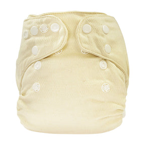 Die Windel besteht aus weichem, ungebleichtem Birdseye-Stoff aus 100 % Bio-Baumwolle und besitzt einen fest eingenähten Saugkern – kein Verrutschen, kein Nachstopfen. Sie hat keine Taschenfunktion und bleibt dadurch besonders schlank im Sitz.